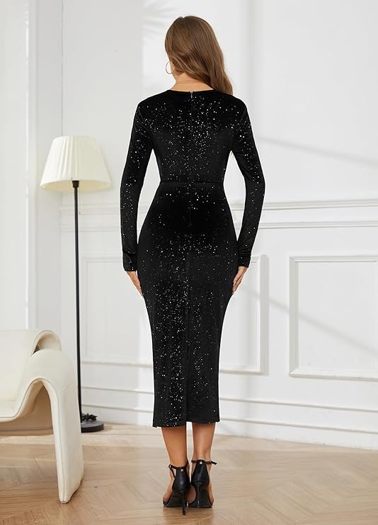 • Great party dress: V-neck, velvet fabric, long sleeves, high waist slit, back zip, flared bottom, glitter, solid color, flattering fit, calf length